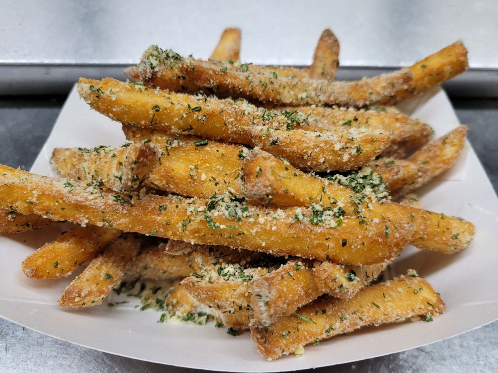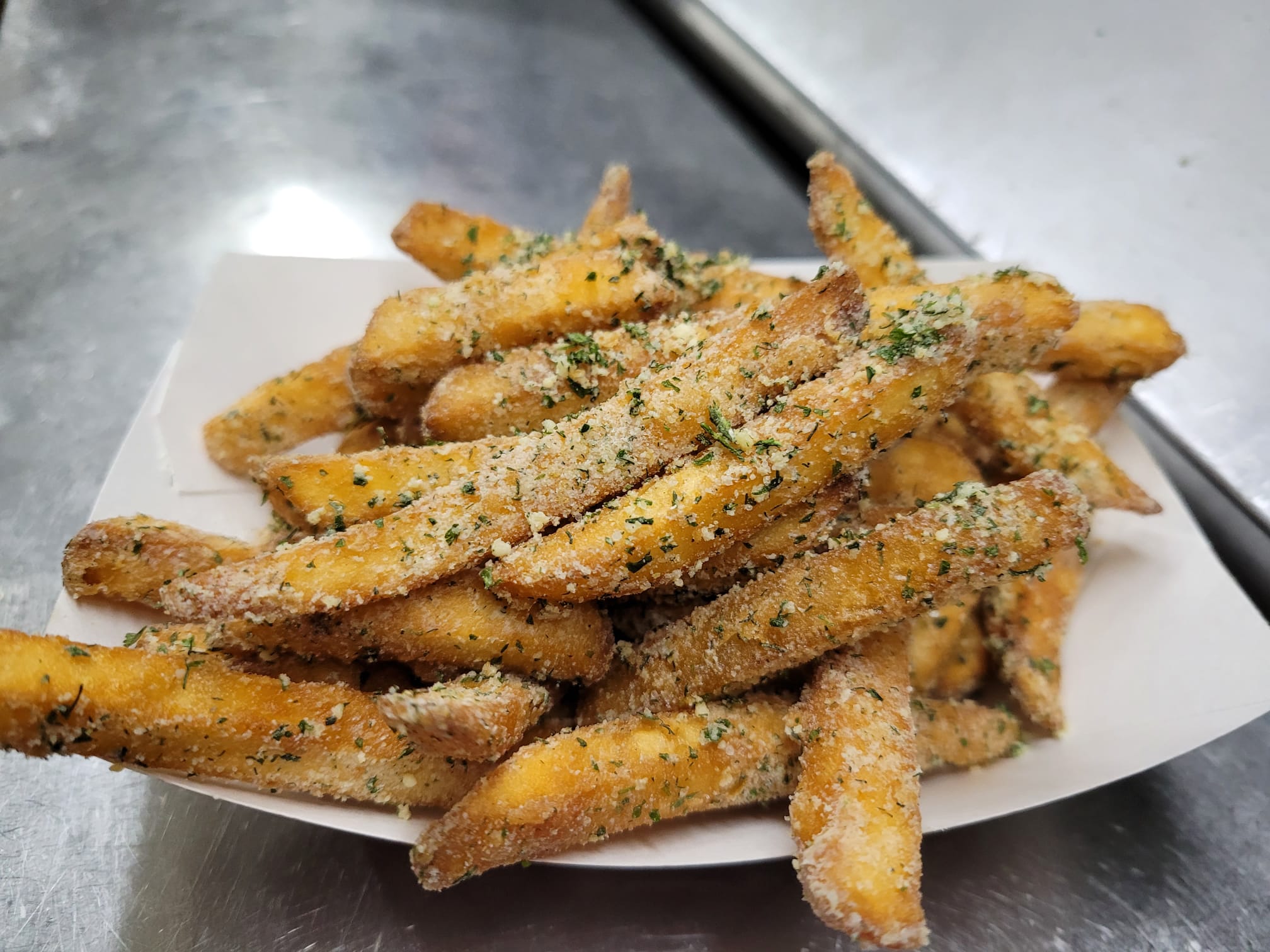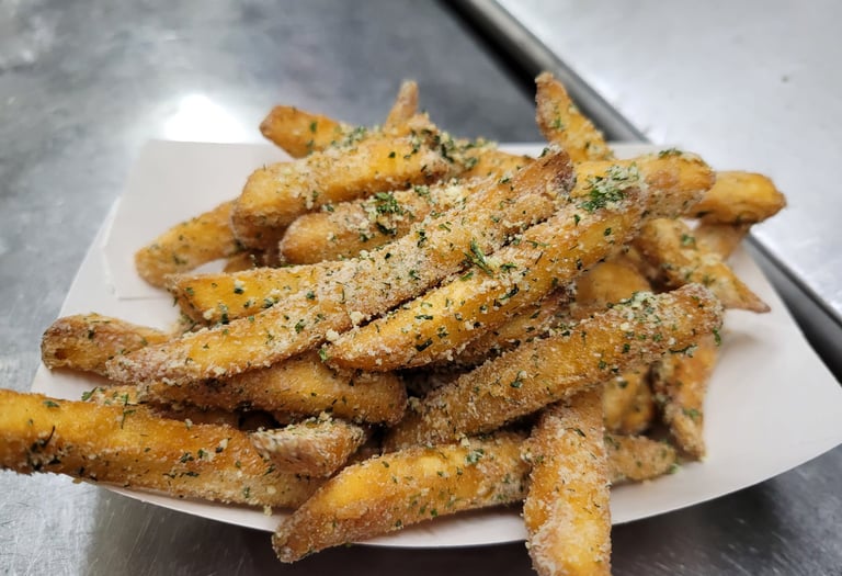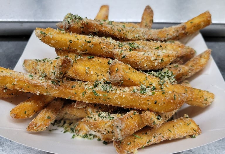 Our famous crispy fries tossed in garlic parmesan seasoning