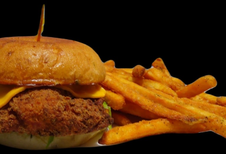 Crispy chicken breast , homemade hot & fruity sauce, lettuce, red onions,and slice of cheddar cheese served on toasted bun & side of fries